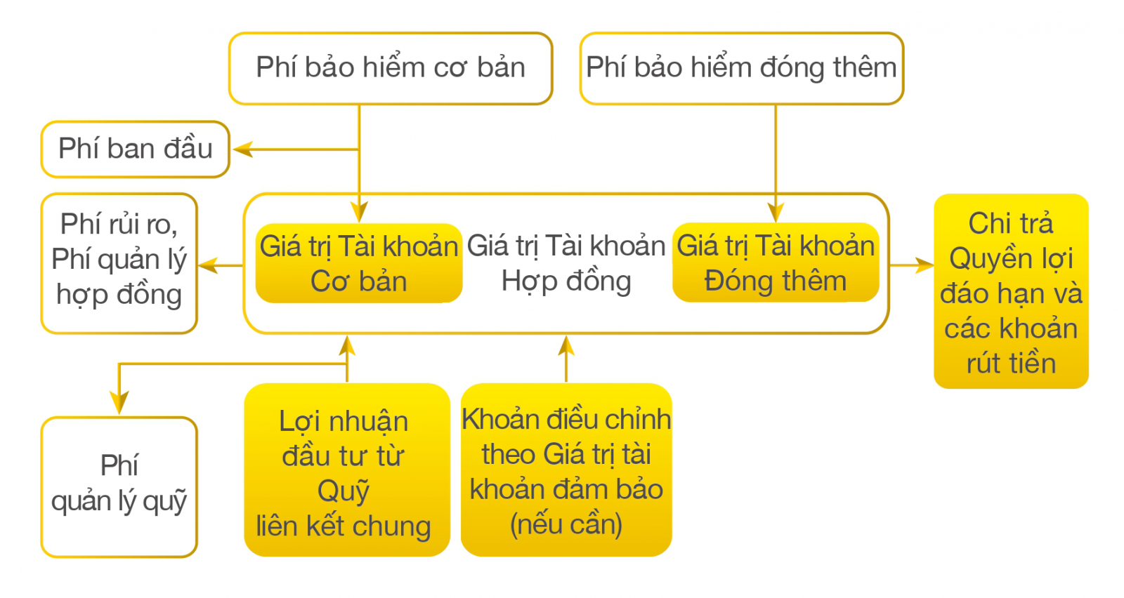 Quyền lợi Cơ bản: Chi trả số tiền lớn hơn giữa Giá trị Tài khoản Cơ bản và Số tiền bảo hiểm thương tật toàn bộ vĩnh viễn, cộng với Giá trị Tài khoản Đóng thêm.